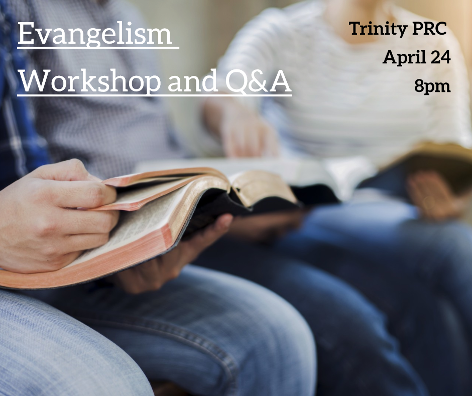 Join us tonight for another workshop on evangelism with a question-and-answer panel on personal evangelism for young people and young adults. This workshop will be hosted by the Young Calvinists at Trinity PRC at 8:00 p.m. You will have the opportunity to ask questions focused on evangelism to a panel of men and women with evangelism experience.